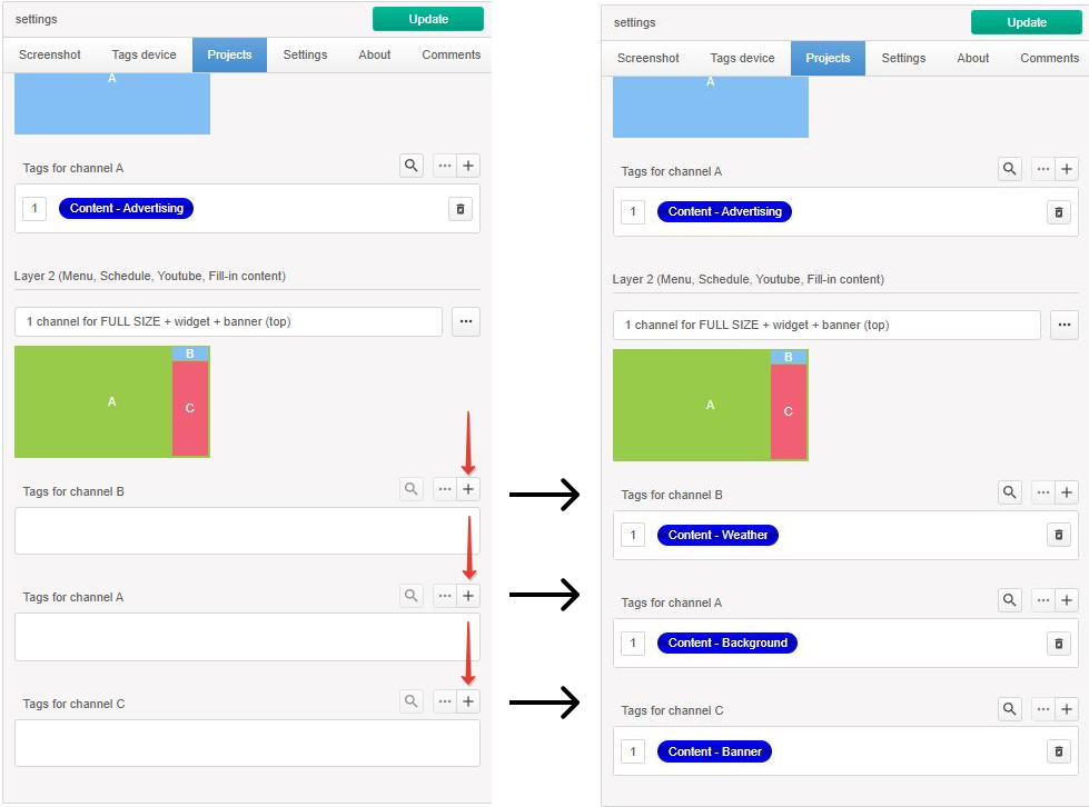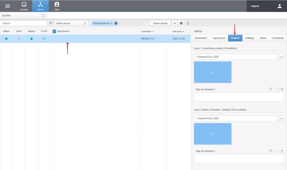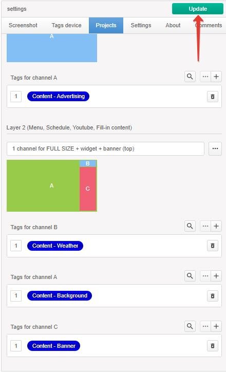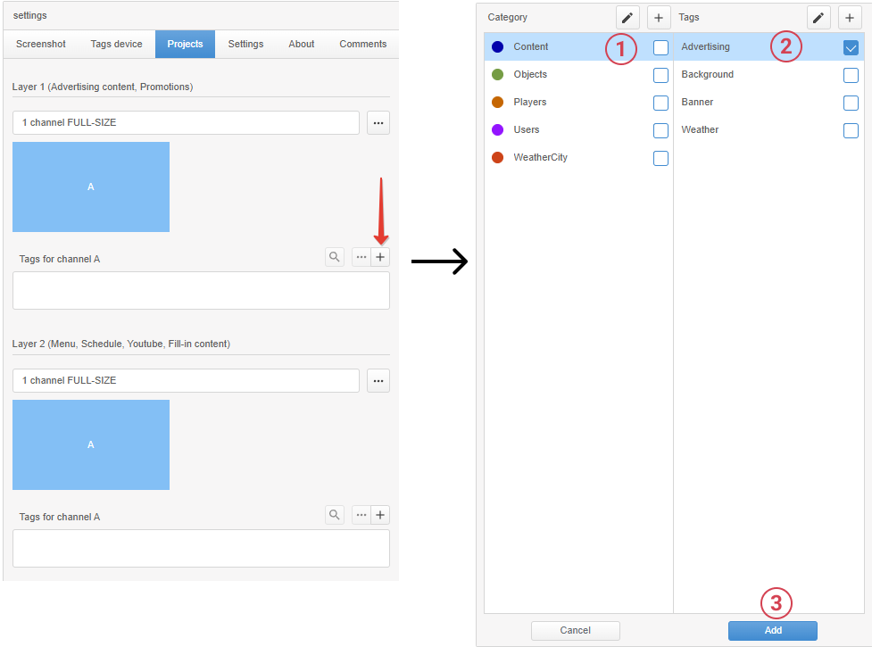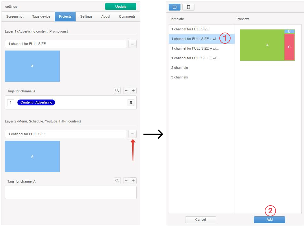 DS-PRO provides the ability to play content in two independent video layers (Layer 1 and Layer 2). Each layer can have an individual template, a set of tags, and therefore a different set of content. The difference between layers is the priority of displaying the content published in them: files published in Layer 1 will be played, interrupting and pausing the playback of files published in Layer 2.