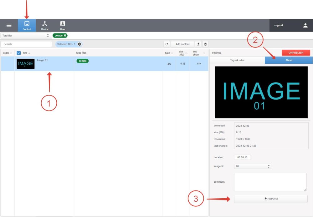 To download the report, go to the Content section, select the file or files (using Shift), then go to the About section and click Report to download the report.