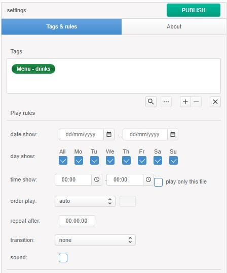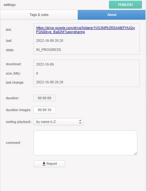 If a link to a Google Drive folder is used, the display properties settings will be applied to the folder as a whole file. To configure the behavior of files inside a folder, namely the order in which files are displayed and their duration, go to the About section.