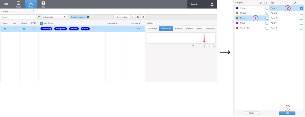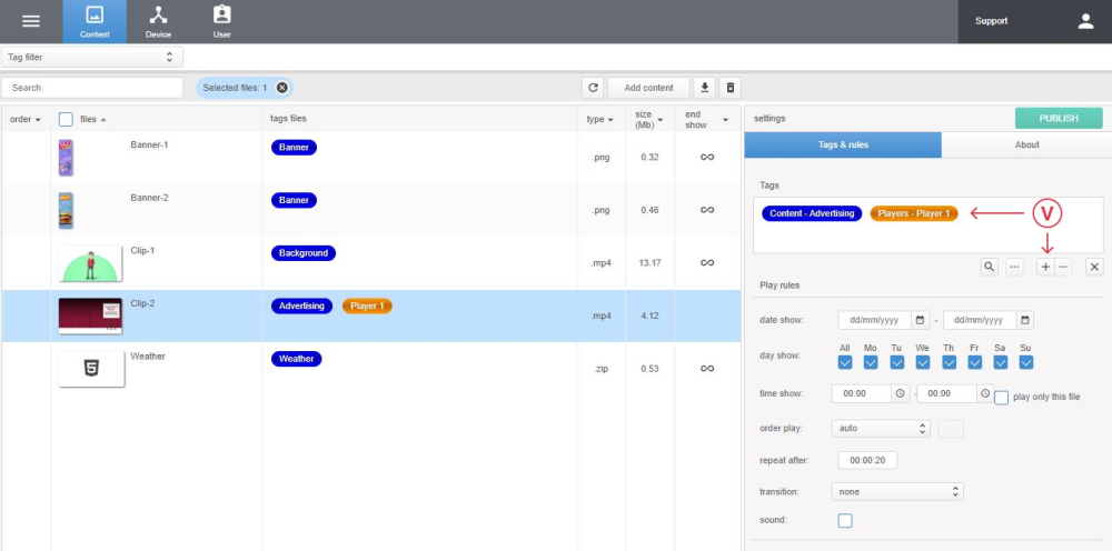 Now, to publish a video on certain devices, give it the template channel tag – Advertising and the tag of the required devices – Player №.