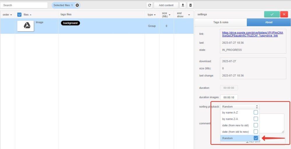 New content sorting mode in Google folders – Random. Use this mode if you want the contents of the same folder to be played on published devices in different orders.
