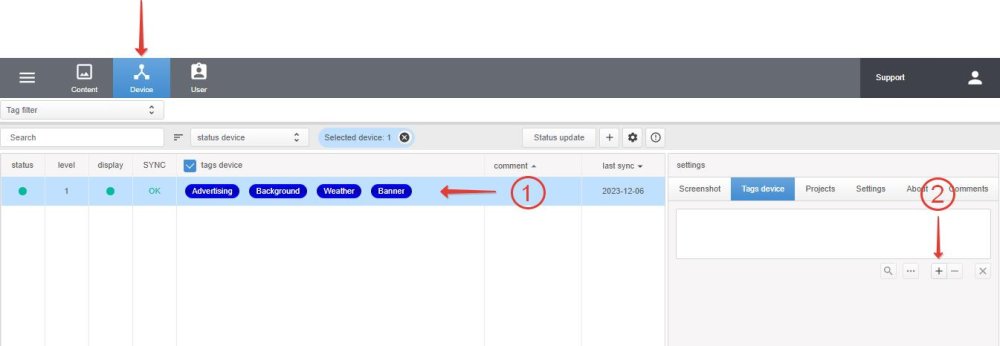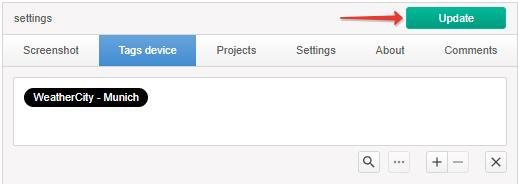 The name of the city for the weather widget is transmitted using the WeatherCity tag specified to the device in Tags device. To add a tag, go to the Device section, select the device in the Device section and click “+” in Tags device.