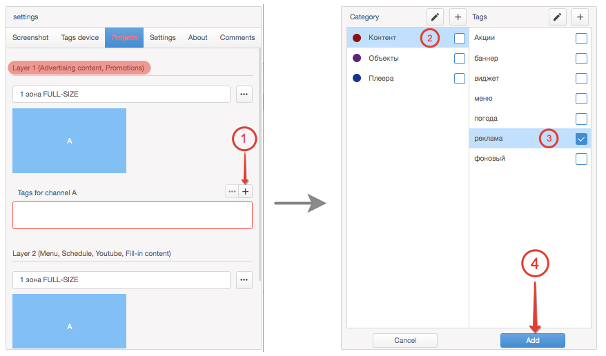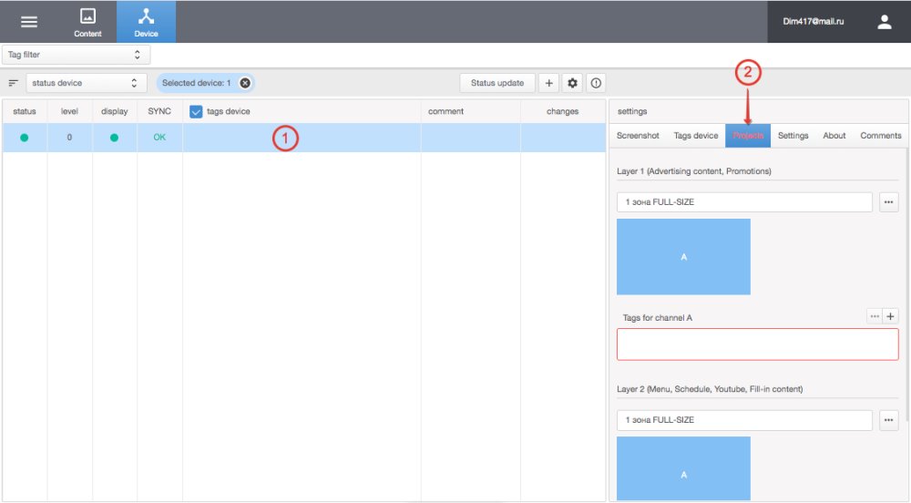 В DS-PRO представлена возможность воспроизведения контента в двух независимых видео-слоях (Layer 1 и Layer 2). Каждый из слоев может иметь индивидуальный шаблон, набор тэгов, а следовательно разный набор контента. Отличие слоев заключается в приоритете показа опубликованного в них контента: файлы, опубликованные в Layer 1 будут воспроизводится прерывая и ставя на паузу воспроизведение файлов опубликованных в Layer 2.