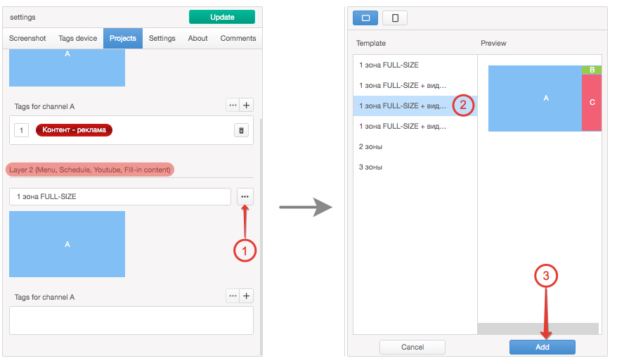 - для Layer 2 выбираем шаблон с 3-мя зонами. Кликаем на “+” и выбираем 1 зона FULL-SIZE + виджет (верх) + баннер (низ)