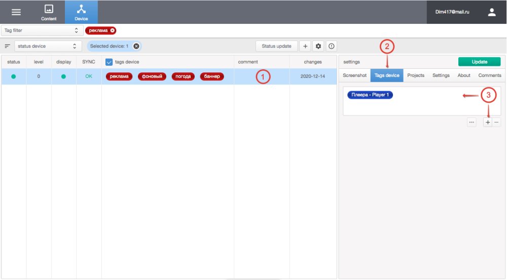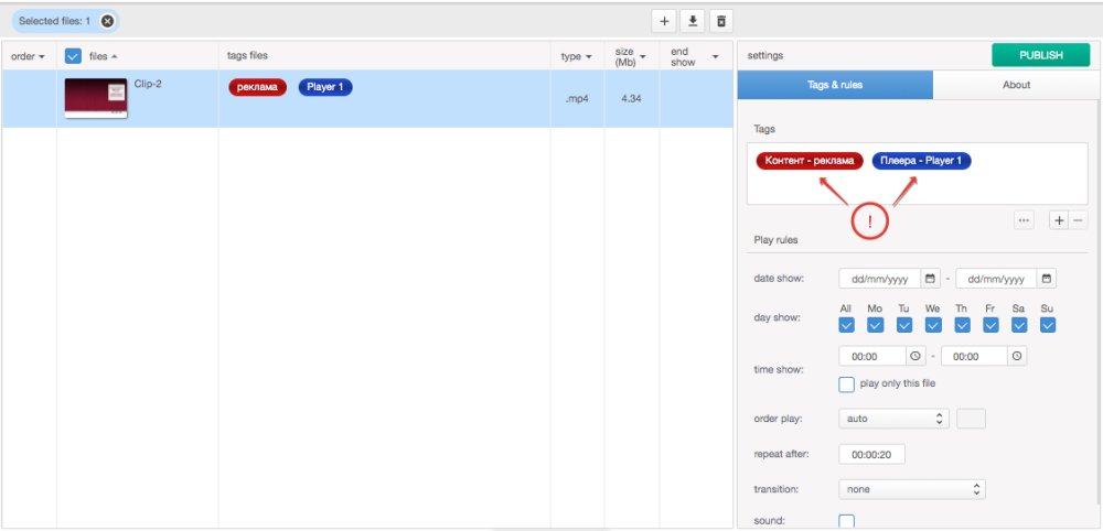 Теперь, для публикации ролика на определенные устройства, укажите ему тэг зоны шаблона- Реклама и тэг нужных устройств – Player №.