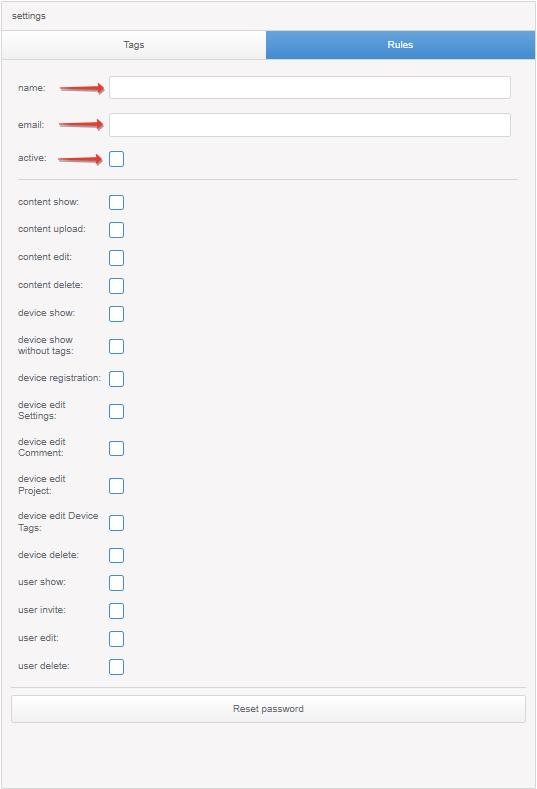| Reset password | Сброс пароля Пользователя – на указанную в настройках эл.почту будет отправлено письмо с новым паролем |