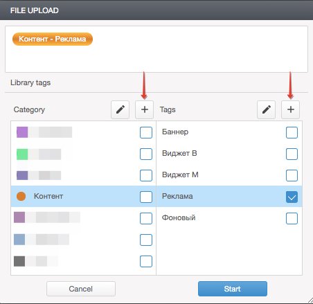 Укажите тэги с которыми файлы будут загружены на сервер. В дальнейшем, вы сможете добавить, удалить или заменить указанные тэги на другие. Для создания нового тега или категории, нажмите “+”.