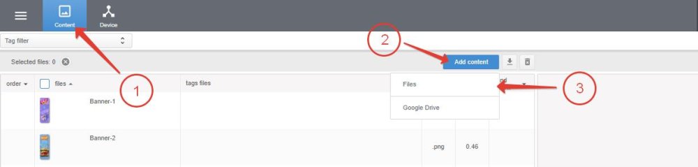 Для загрузки файлов перейдите в раздел Content, кликните Add content и далее Files.